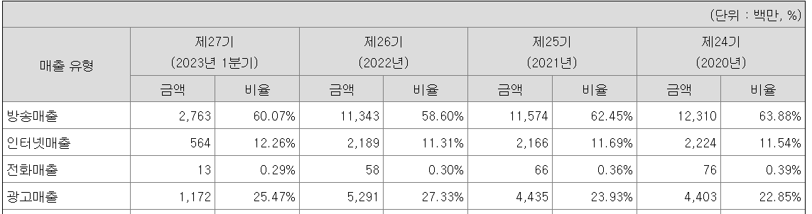 - 현재 매출 구성은 방송매출 60%, 인터넷 매출 12%, 광고매출 25%, 기타 매출 3%입니다.