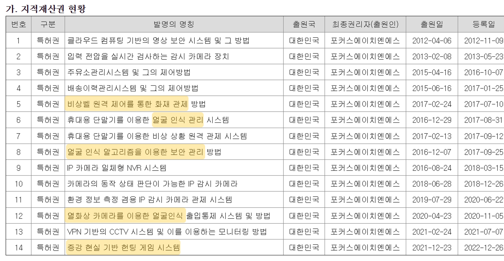 근거는 위 지적재산권 현황입니다. 포커스에이치엔에스에는 얼굴 인식과 그것을 이용한 응용 기술이 있습니다. 이런 기술덕분에 인공지능 카메라(AI CAM)는 회사의 주요 매출로 자리잡고 있습니다. 또한 5번 특허인 화제 관제, 14번 특허인 증강 현실 특허도 각각 해당 테마로 확장될 수 있는 여지를 보입니다.