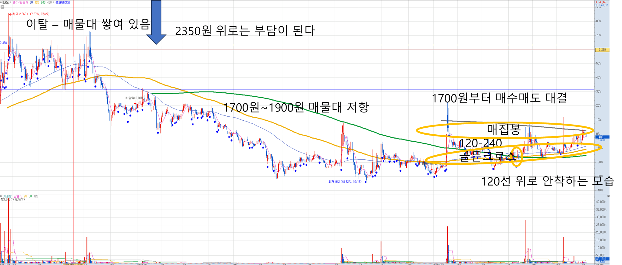 - 역배열 구간에서 2023년 4월에 120일선과 240일선의 골든 크로스가 있었습니다.