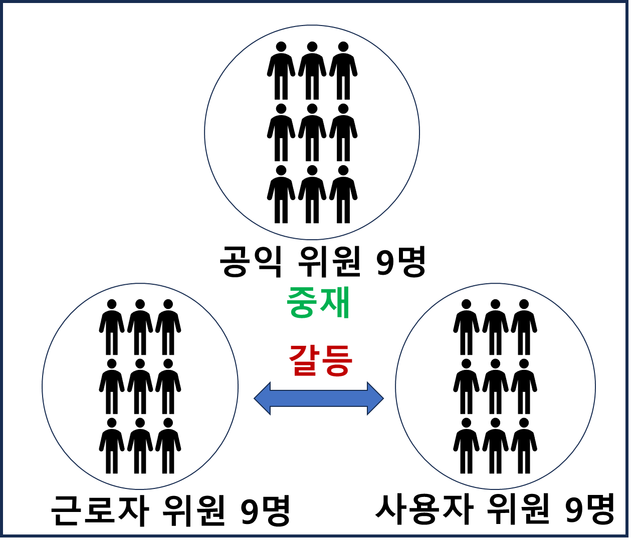 이 위원회는 근로자 위원, 사용자 위원, 공익 위원이 각각 9명씩으로 구성됩니다.