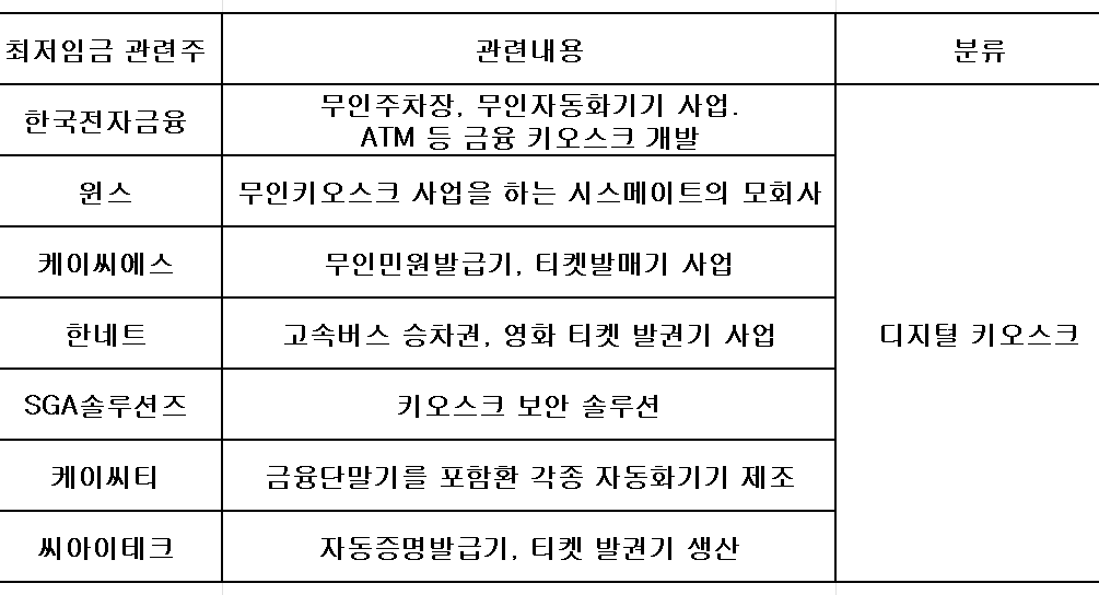 디지털 키오스크에 대한 수요가 늘어날 것으로 보입니다. 실제로 디지털 키오스크 관련주들은 최저임금의 유의미한 상승이 있을 때마다 테마주로 주목받곤 했습니다.
