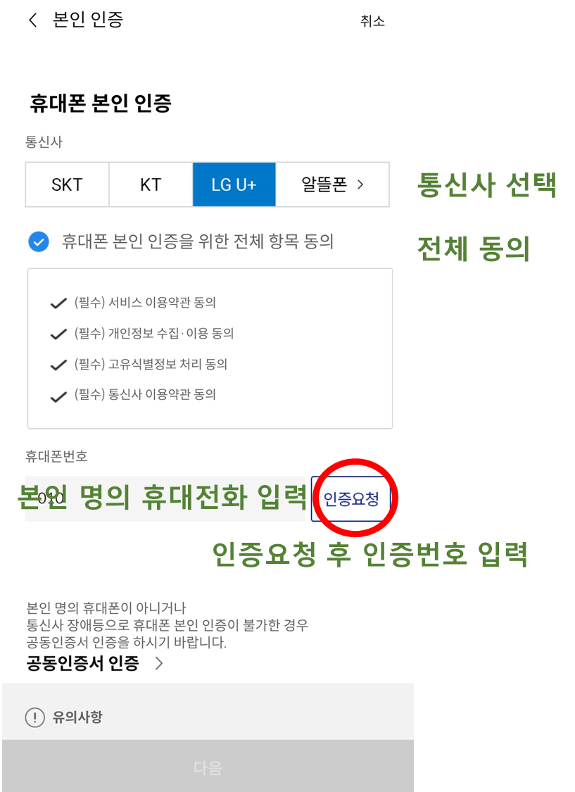 이름(국문)과 주민등록번호, 휴대전화를 입력하시고 다음을 누르면 휴대폰 본인명의 확인 단계로 넘어갑니다.