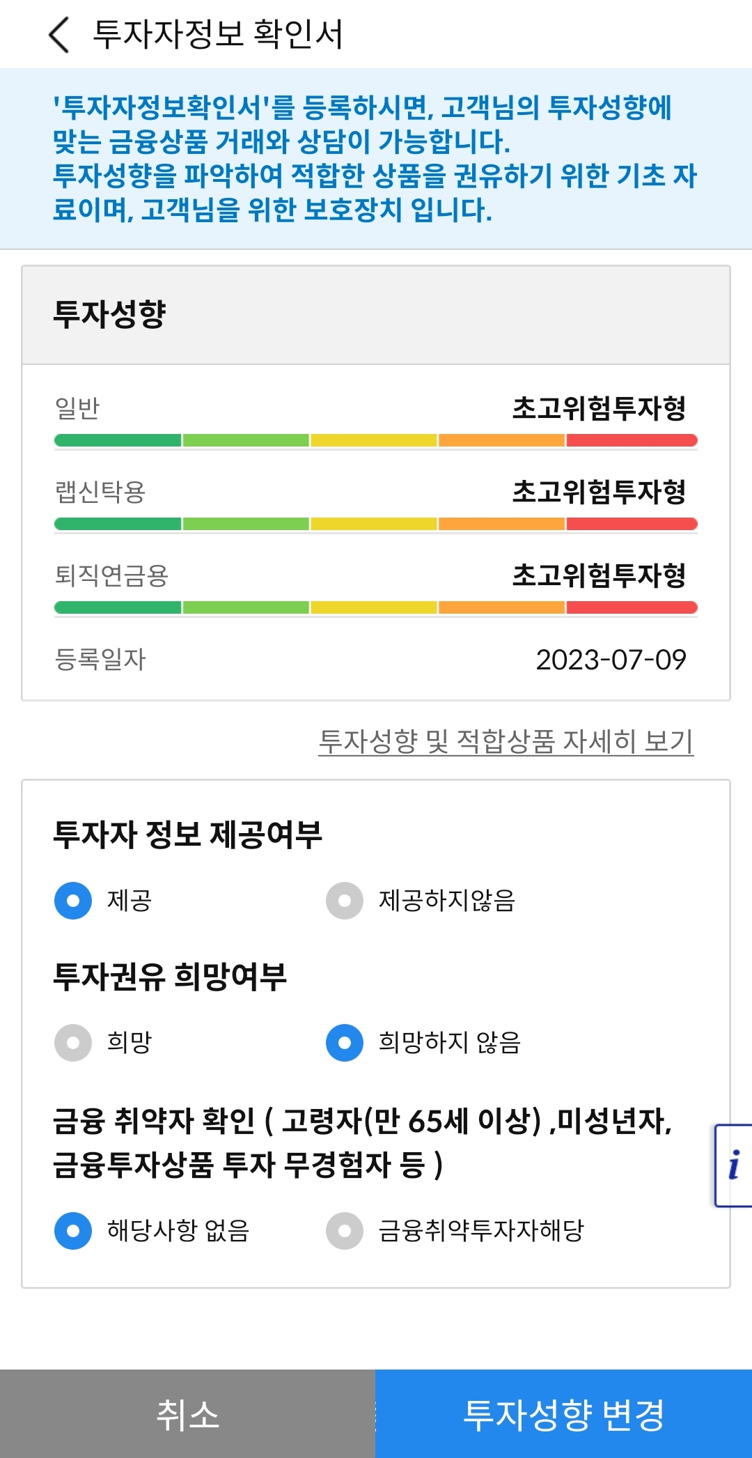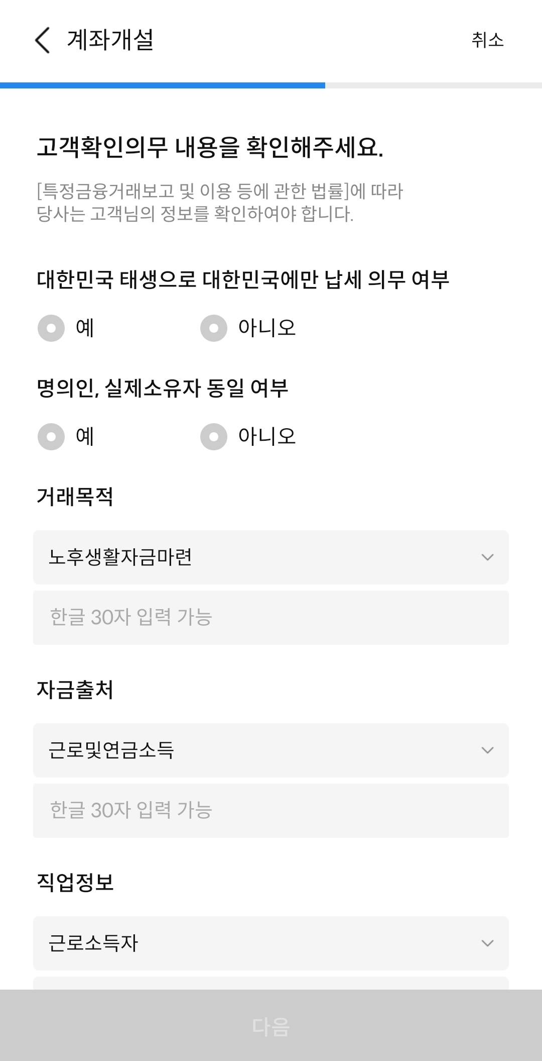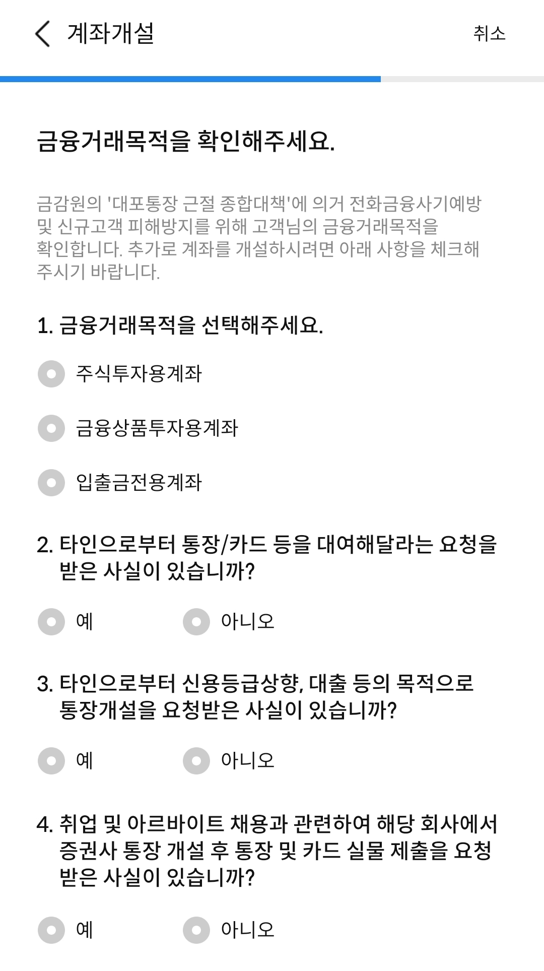 그리고 있는 그대로 거래목적, 투자성향 등을 입력하시면 계좌가 개설됩니다.