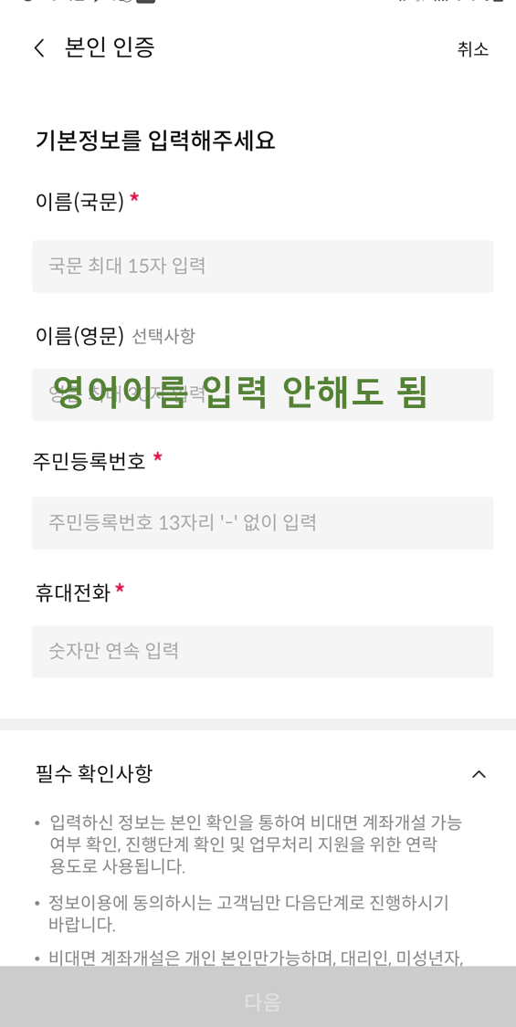 이때 영어 이름은 여권 이름으로 하셔도 좋고, 아직 정해놓은 영문이름이 없는 경우 굳이 입력하지 않아도 다음 단계로 넘어갈 수 있습니다.