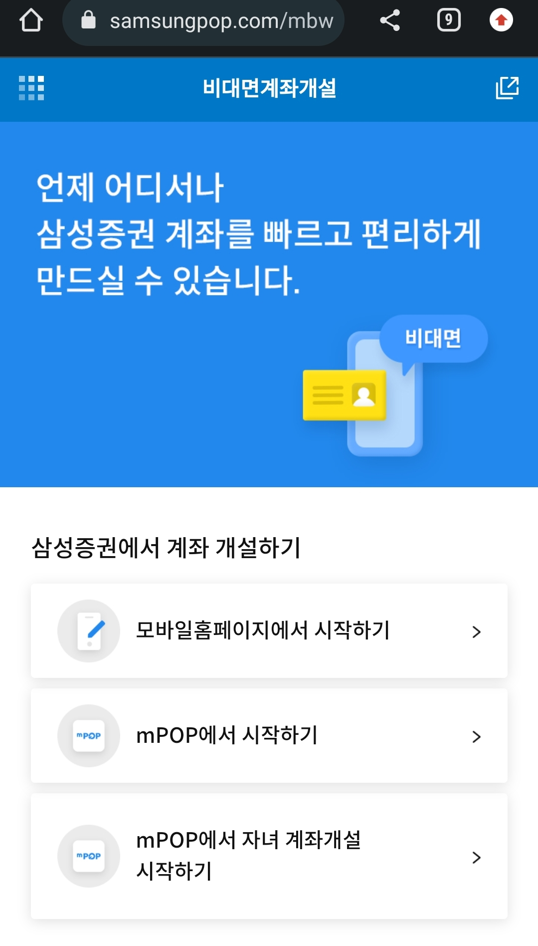 안녕하세요, 오늘은 삼성증권 계좌를 비대면으로, mPOP 앱을 이용하여 개설하는 방법을 안내하겠습니다.