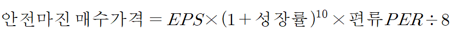 안전마진법은 현금흐름할인법 DCF를 단순화한 방법입니다. 아빠 필 타운은 미국 국채 대신 위험자산에 투자하려면 최소한 15%의 복리 수익률을 얻을 수 있어야 한다고 주장합니다. 이 안전마진 수식은 다음과 같습니다.