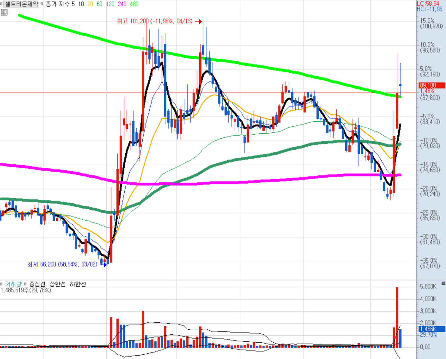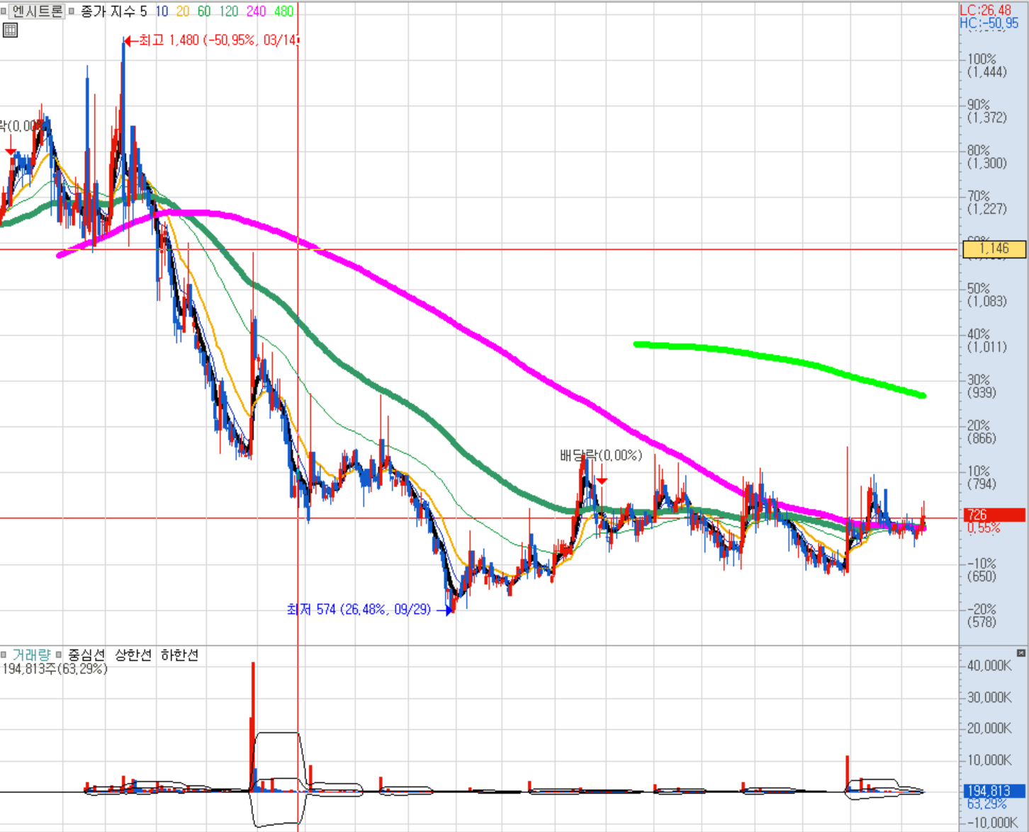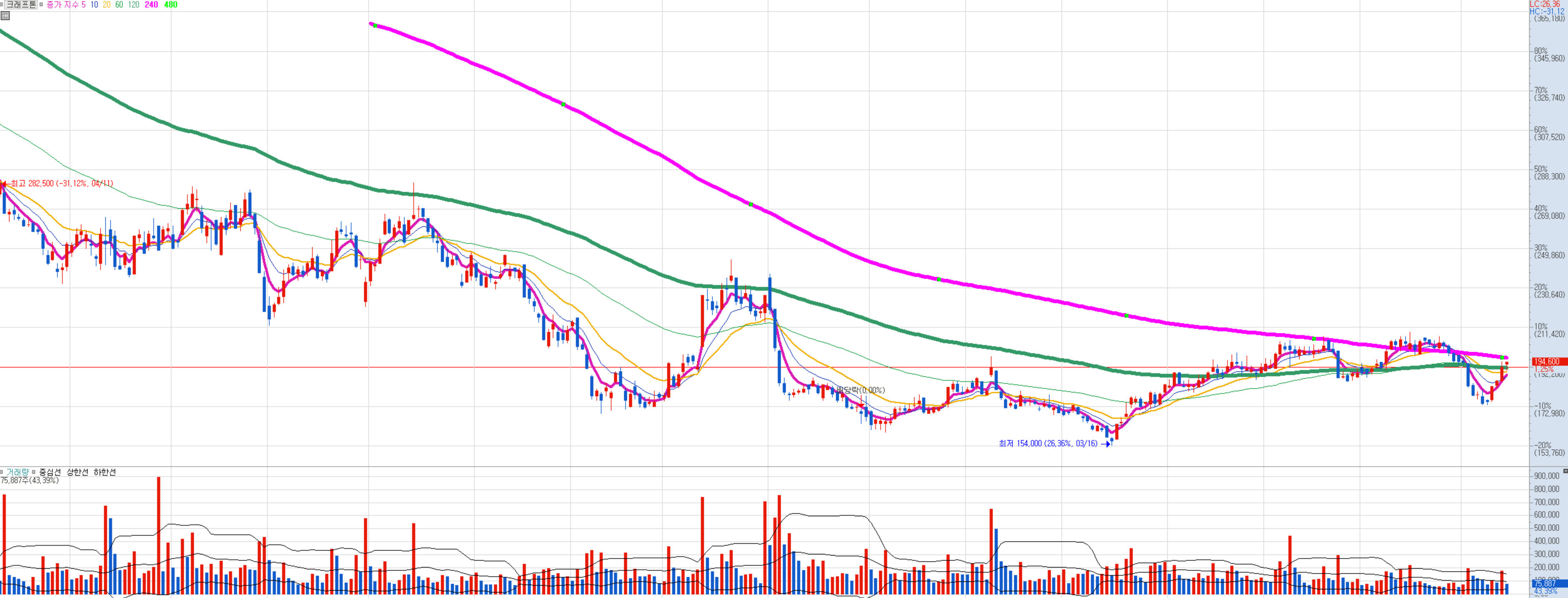 최근 120선, 240선이 모이고 있고 조만간 480선 생김. 120일선 위를 조금씩 돌파 및 지지하려는 모습.