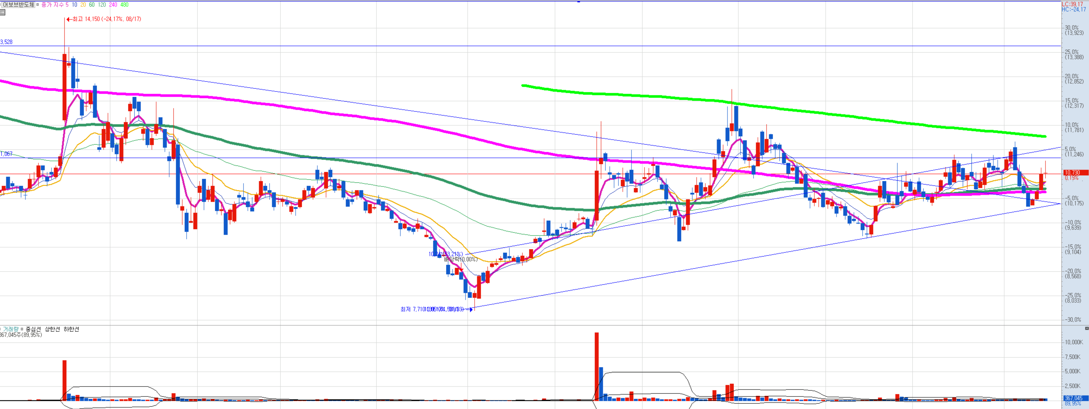 저항인 11000원부터 급등가능 자리. 최근 반도체 섹터의 힘이 강하기 때문에 여차하면 달릴 가능성 있음.