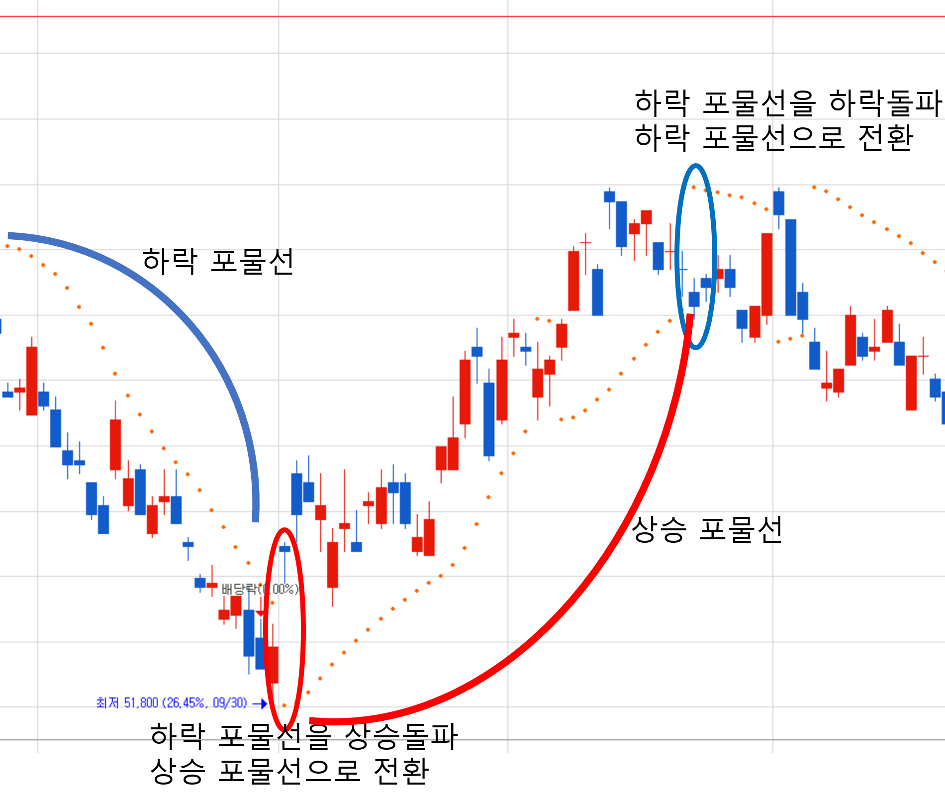 반면 직전 저점에서부터 올라오던 상승포물선을 하락 돌파하면 이제 추세가 하락으로 바뀐다는 의미로 해석되죠.