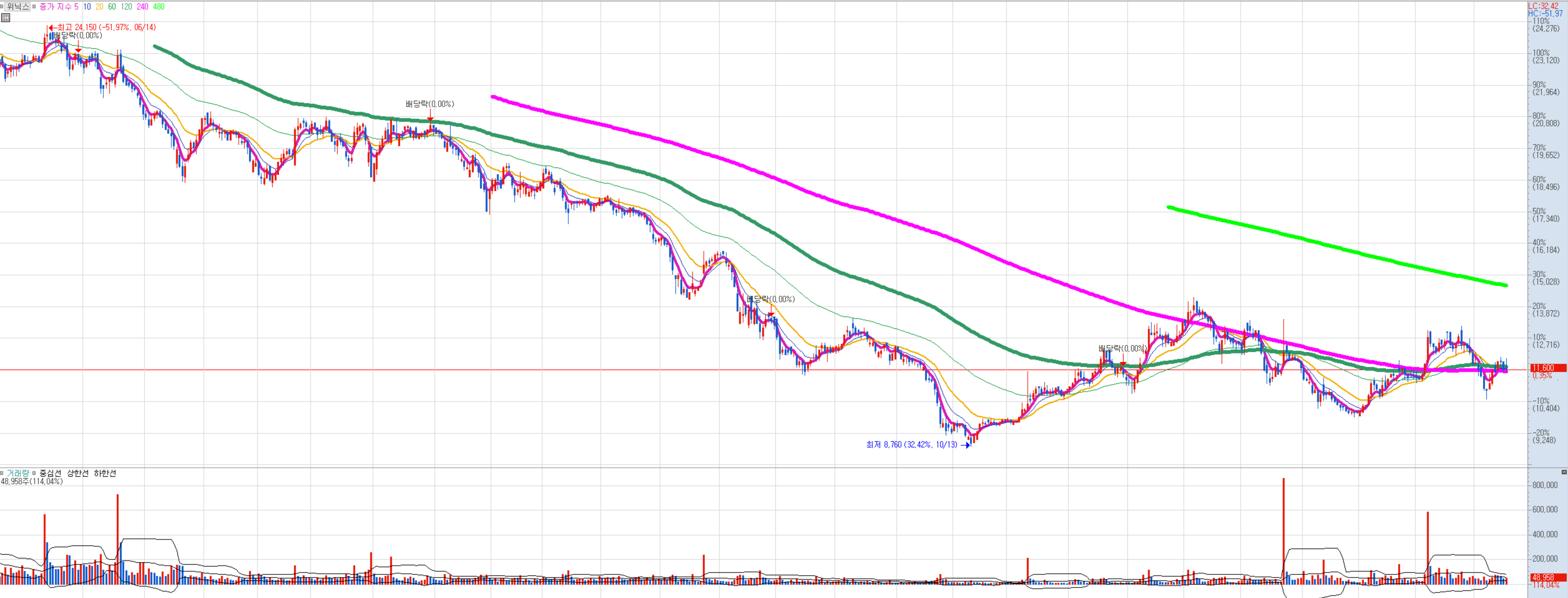 오랜 하락 끝에 최근에서야 추세를 돌리려고 하는 위닉스도 괜찮아 보입니다.