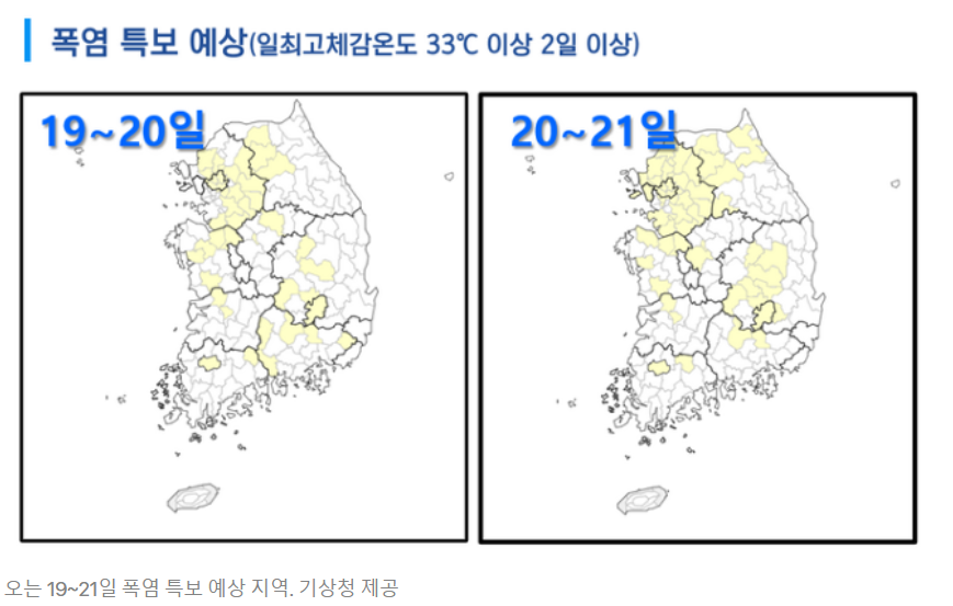 2023년 7월 19일~21일 사이에 폭염특보가 예상된다고 합니다. 그림을 보면 수도권이 포함되는 것을 알 수 있습니다.