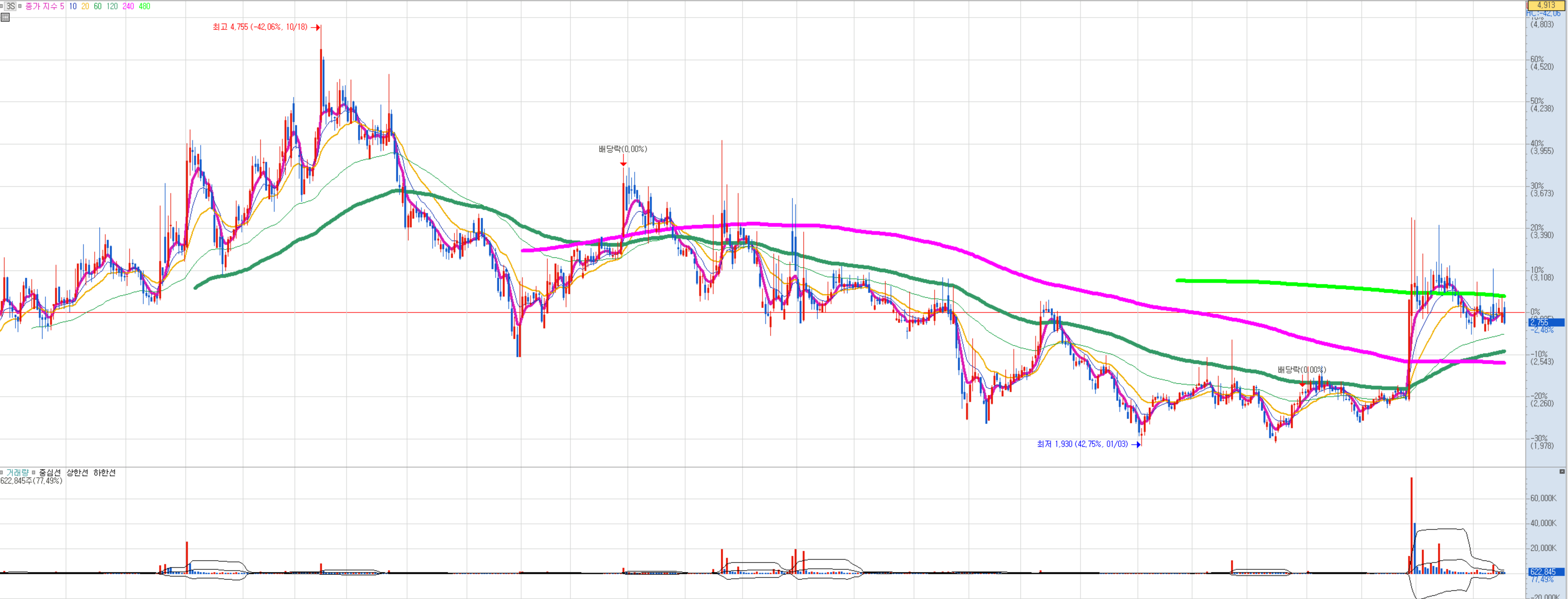 최근 120이평선과 240이평선의 골든 크로스가 있었기 때문에 좋은 흐름이 이어질 것을 기대해봅니다.