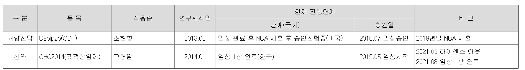 CHC2014 표정항암제는 경구용 표적항암제로서 한독과 공동개발하여 기술수출함. 2023년 6월 22일에 제조방법 특허등록