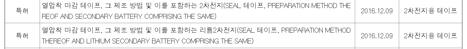 테이팩스는 2차전지용 테이프 중 원통형 배터리의 전극을 보호하는 실링테이프에 특허를 가지고 있다.