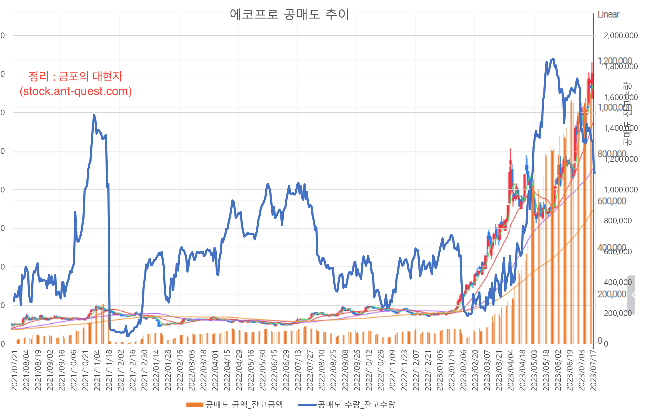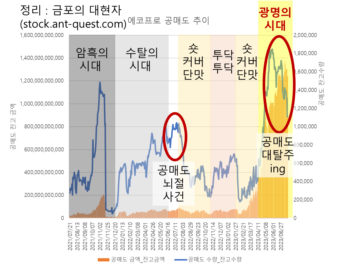 2021년 7월 21일부터 2023년 7월 21일까지의 일봉 차트위에 공매도 잔고수량선을 겹쳐보았습니다. 주가가 오를만하면 공매도를 맞고 떨어지고, 주가가 내릴만하면 공매도를 맞고 더 떨어지던 시절이 있었습니다.