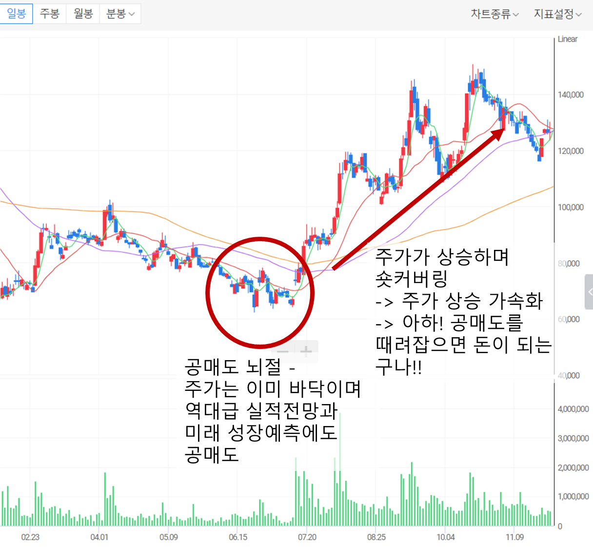 한번 공매도를 치기시작하면 60만주에서 100만주까지 공매도를 하는 바람에 개인투자자들로서는 도저히 버틸 방법이 없었던 시절입니다. 오를만하면 내리고, 내릴만하면 더 많이 내린 시절이죠. 간혹 숏커버링이 들어오면서 작은 상승 반전도 있었지만, 결국에는 공매도의 승리로 끝나던 시절입니다.
