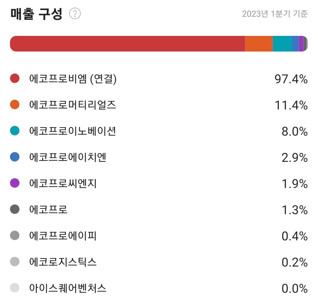 에코프로는 자회사를 여럿둔 지주회사죠. 그래서 연결재무제표에 에코프로비엠의 매출이 잡힙니다. 심지어 위 매출 구성을 합하면 100%가 넘죠? 123.5%입니다. 계열사 간의 거래가 23.5%있다는 이야기입니다. 따라서 자회사가 이미 상장되어 가치평가를 받고 있는 에코프로의 재무는 꽤 뻥튀기 되어있는 상태입니다.