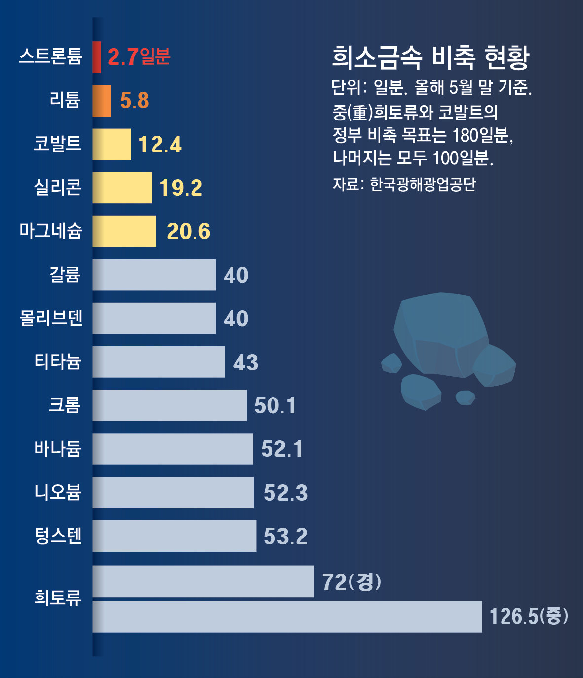 희토류, 갈륨 등 희소금속 비축량이 정부가 목표로 잡고 있는 양의 42%로 절반에도 못 미치는 것으로 나타났다. 미중 갈등이 중국의 광물 수출 통제로까지 이어지면서 각국의 자원 확보전이 더욱