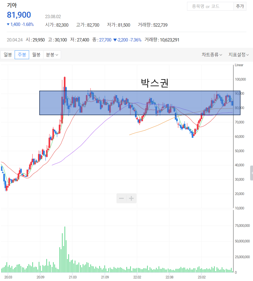 기아의 경우 하락돌파와 회복이 있었지만 7만5000원-9만원 박스가 강력하다고 보입니다. 이 박스를 돌파하면 굉장한 상승이 있을 것으로 기대하는 바입니다.