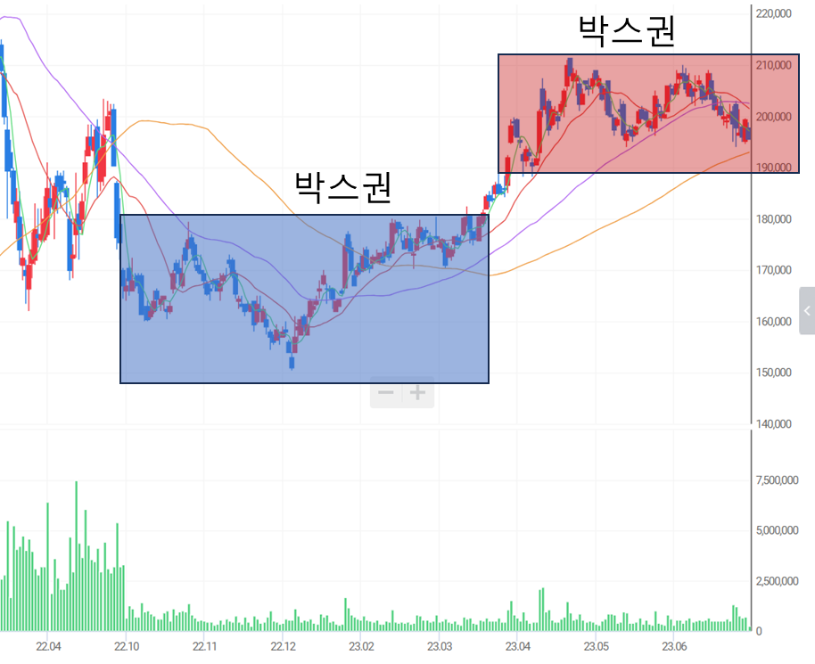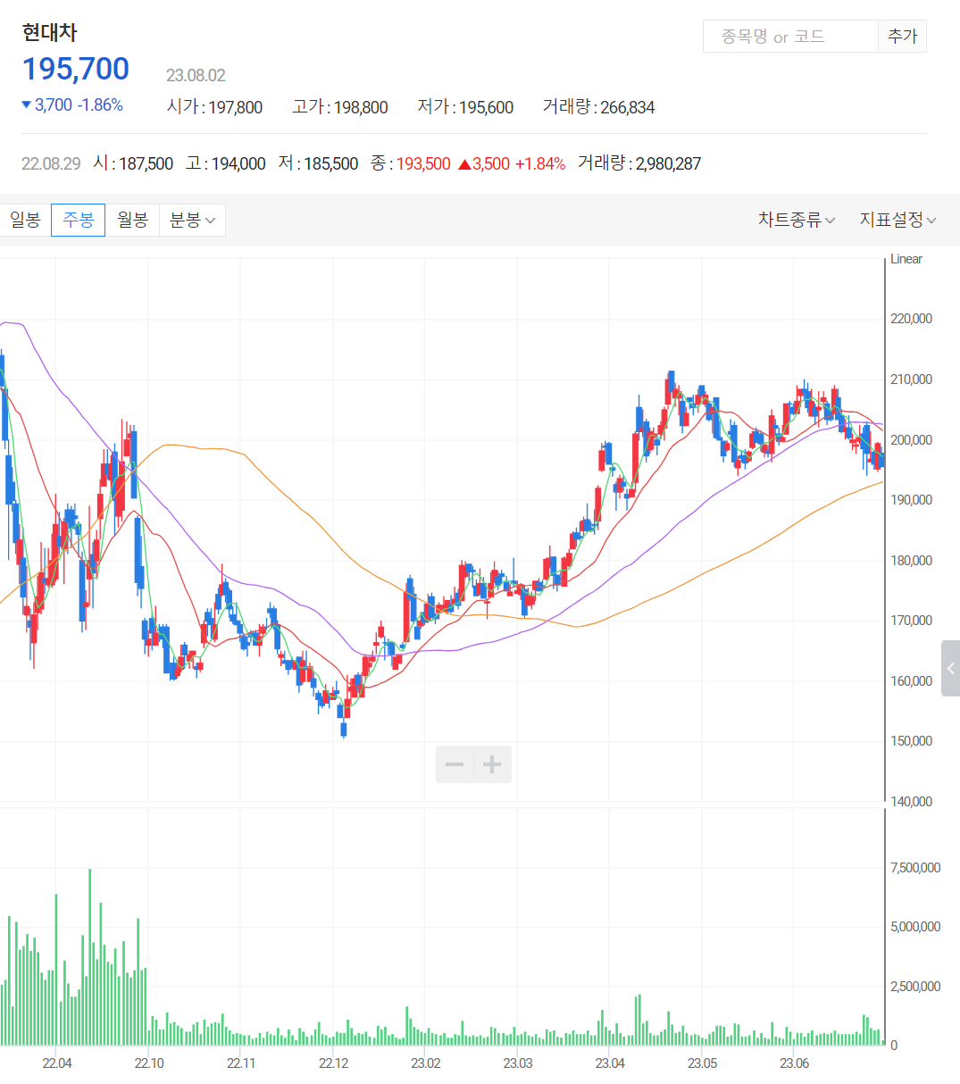 현대차는 대형주 특유의 박스권을 그리면서 움직이고 있습니다. 박스권을 돌파하고 나면 돌파자리를 지지선삼아 새로운 박스를 형성하는 것인데요.