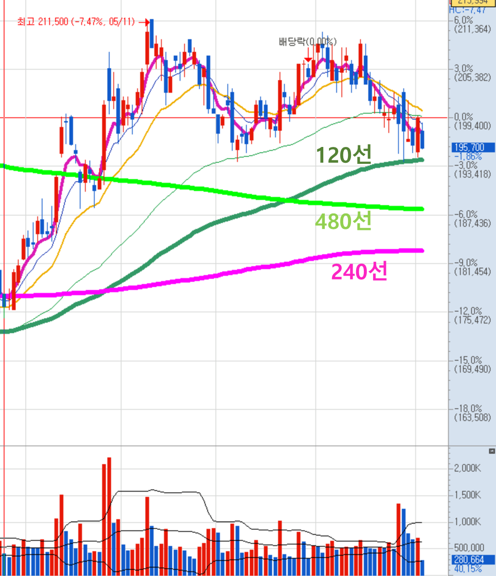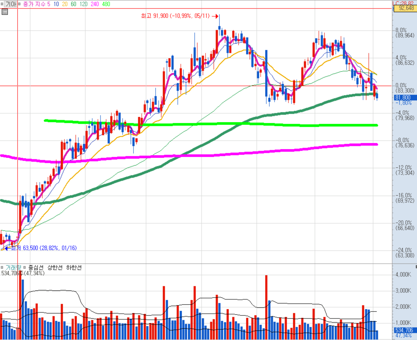 기아의 경우 120선근처에서 왔다갔다하고 있는데요. 480선 근처까지 떨어져주면 부담없이 매수가능하다고 판단합니다.