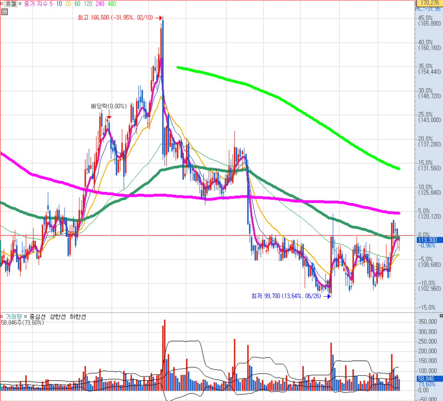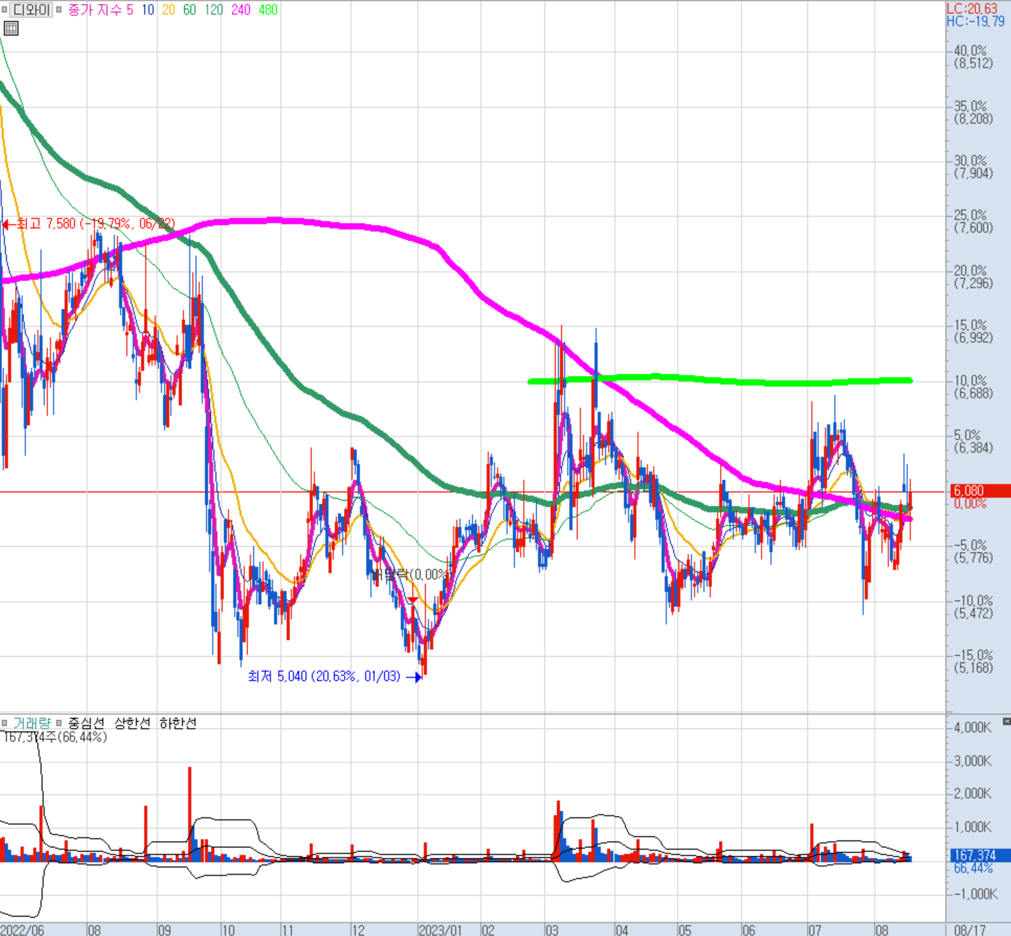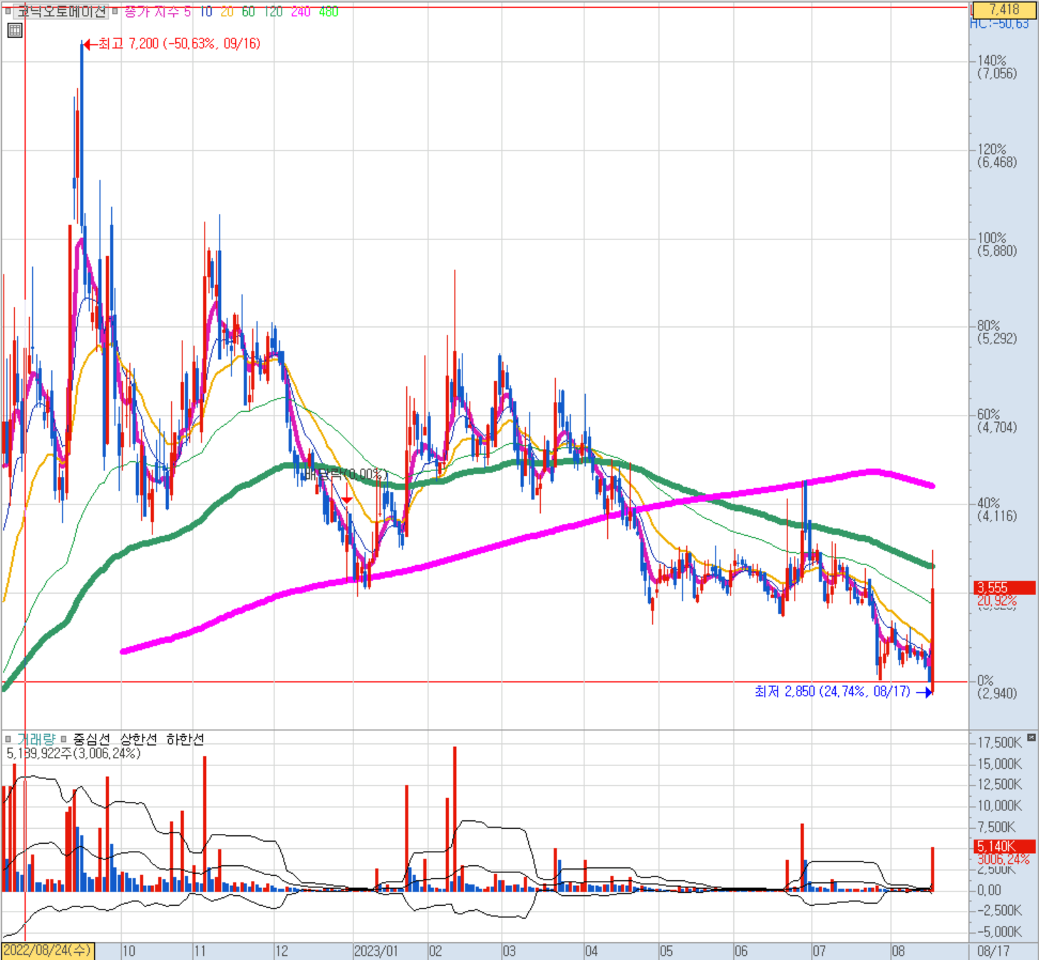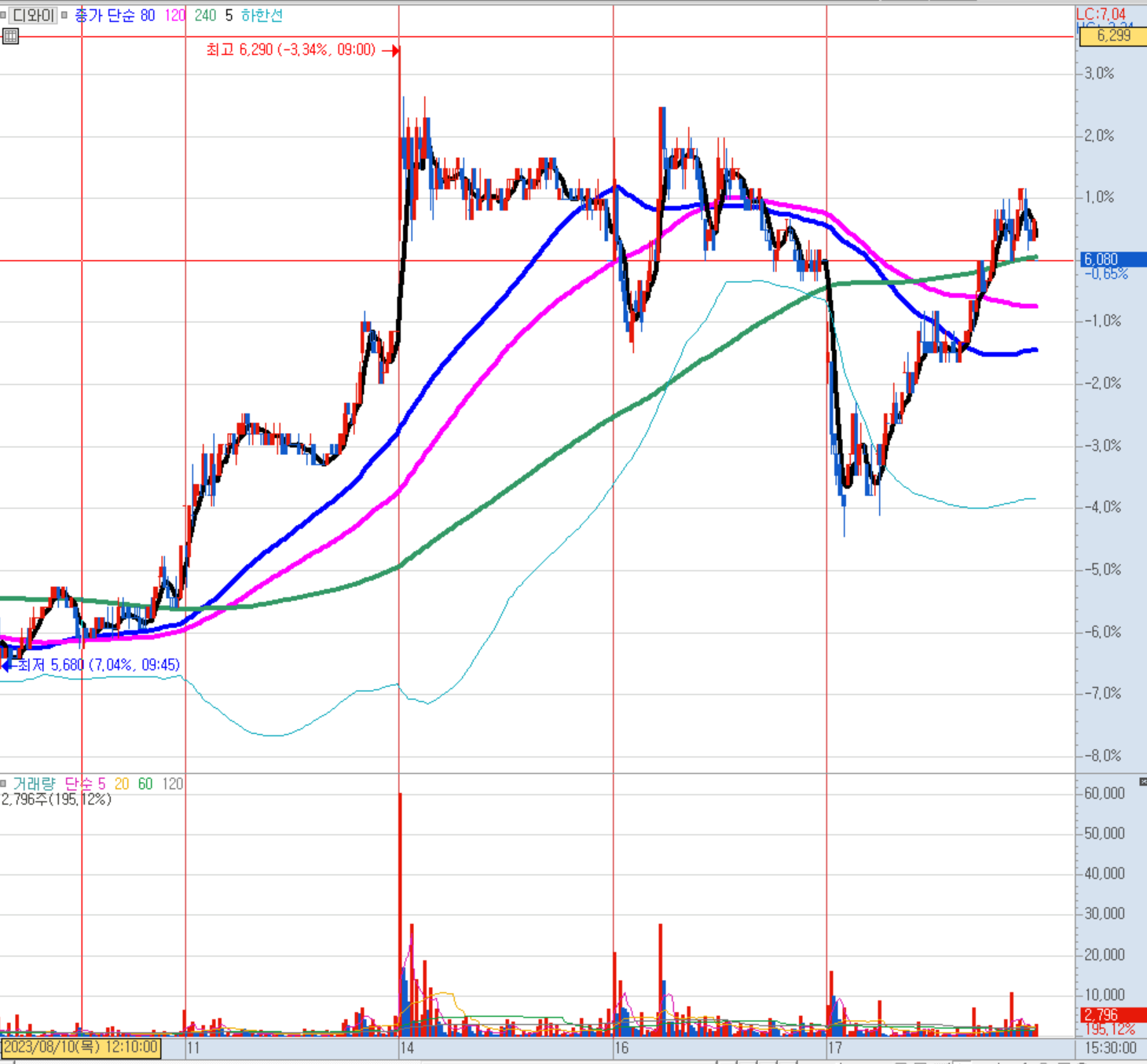 당일 등락폭이 꽤 됨. 당일 박스 수익 1~2% 노려봄직함. 현 자리에서 박스 돌파에 대한 기대도 있음.