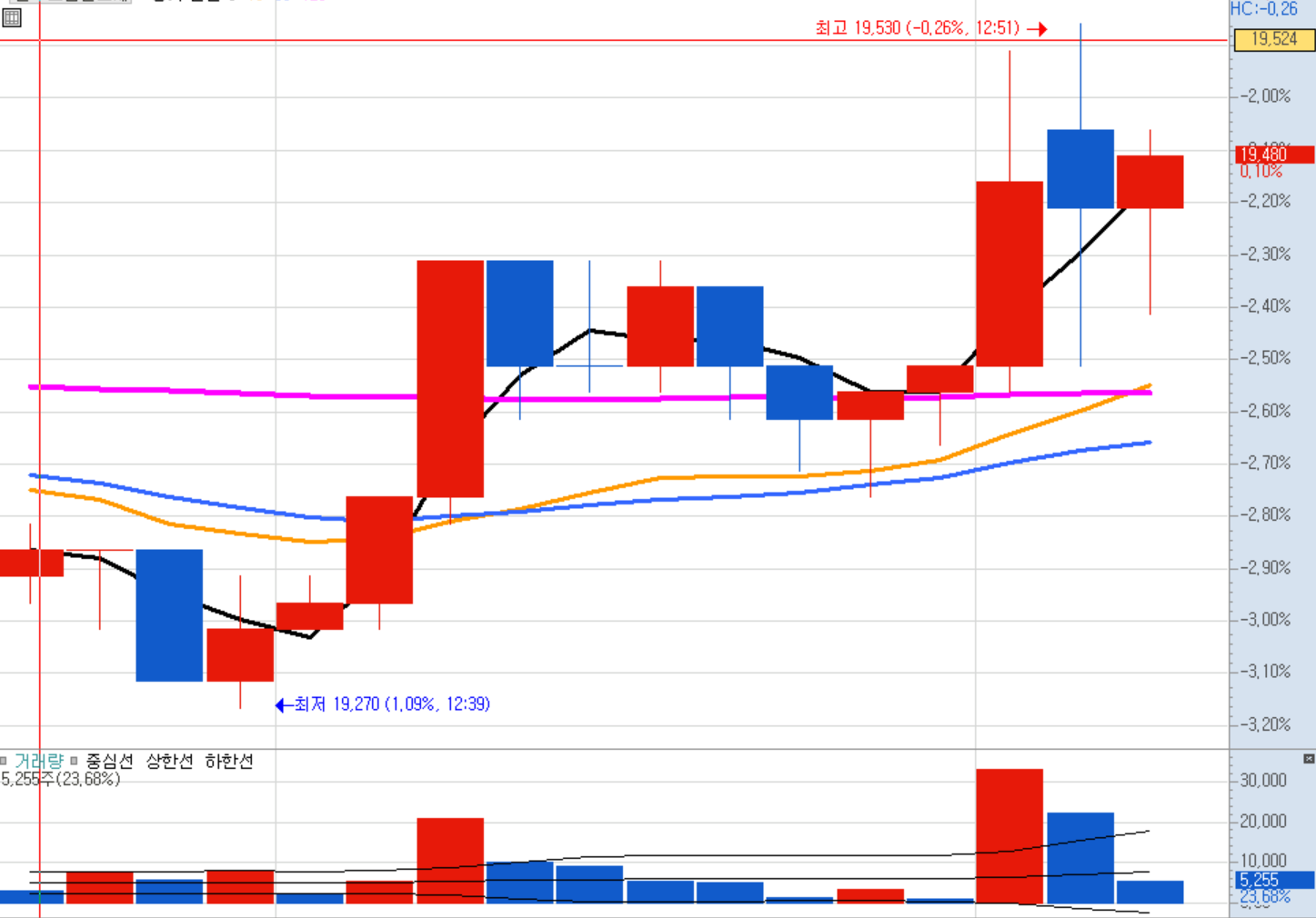 5) 중요한 변동 자리는 120선과 전일종가인 19900원을 생각함.