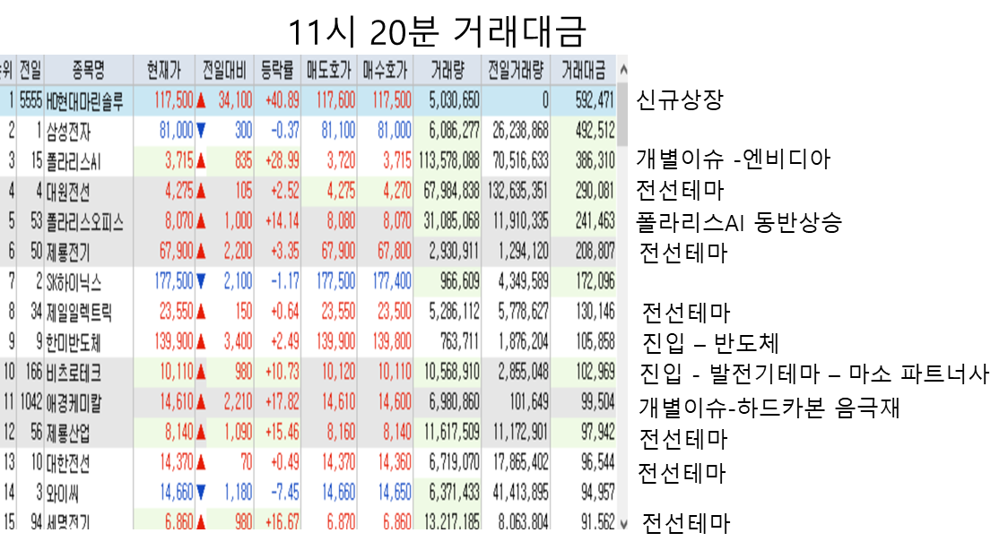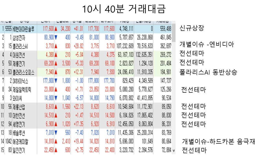 어제부터 이어진 전선테마가 장초반 강한 거래대금을 동반하며 상승한 이후,