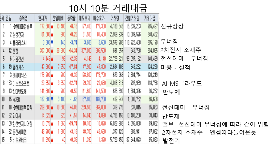 10시 10분쯤 되서는 전선 테마가 약세로 돌아서며 무너지는 모습을 보였다.